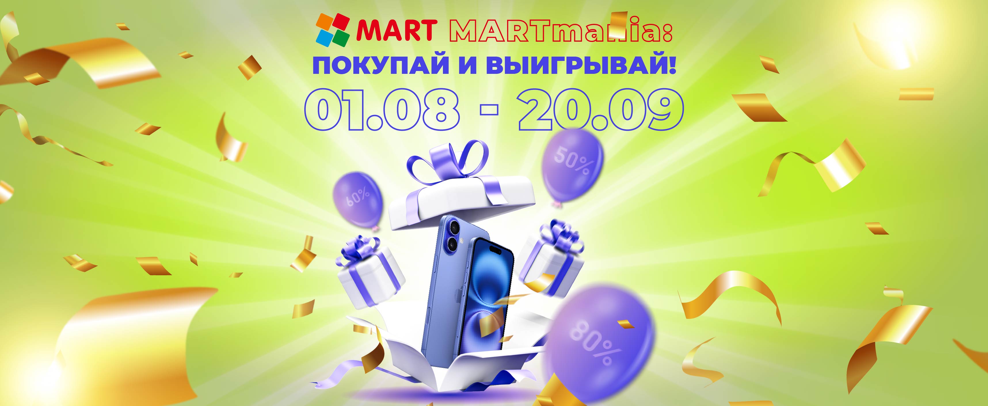 С 1 августа по 20 сентября совершай покупки в магазинах ТРЦ MART от 15 000 тенге и выиграй iPhone16 и другие подарки!